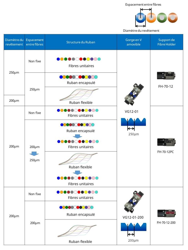 Le RT-02 est un outil qui permet une mise en ruban rapide et facile, en partant de 12 fibres individuelles, de manière temporaire, afin d’être soudées avec la 90R12. Aucune colle ni adhésif n’est nécessaire lors de l’usage de cet outil de mise en ruban puisque les fibres sont ensuite immédiatement mises en place dans le support de fibre. Le RT-02 n’exige pas de l’utilisateur d’insérer les fibres dans la séquence de code de couleur, ce qui est nécessaire avec d’autres outils d’arrangement de ruban. L’utilisateur peut choisir n’importe quelle fibre au hasard, et la placer dans la fente correcte en se référant à l’étiquette de code de couleur sur l’outil. Le RS-02 est utilisable pour mettre en ruban les fibres de revêtement de 200µm et 250µm. Il est également capable de rubaner des fibres de revêtement de 200µm en ruban de fibre avec un pas de 250µm grâce au support de fibre de conversion de pas FH-70-12PC.