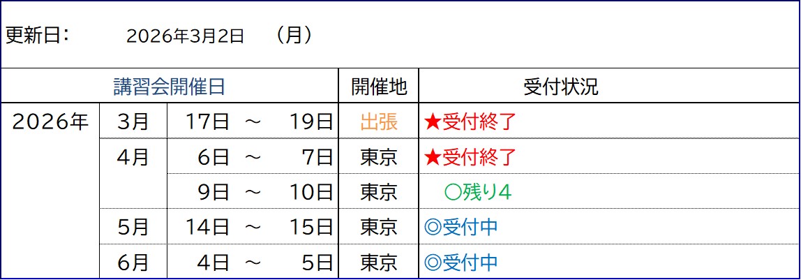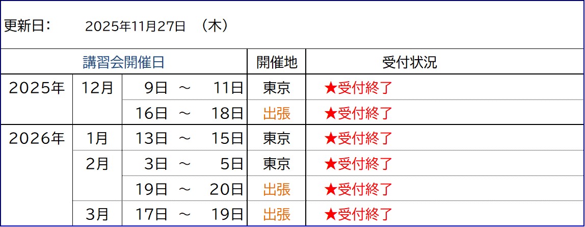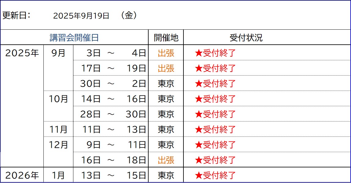 出張コースは4名様から承り、全国へ出張開催可能です。人数に応じて団体割引が適応される場合もございますので、詳しくは講習会窓口までお問い合わせください。