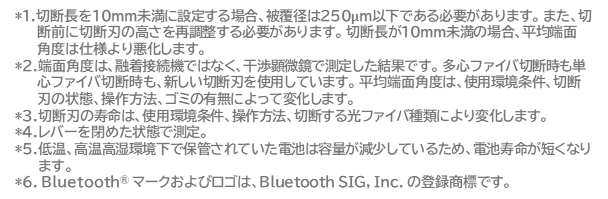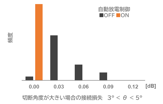 下のグラフは光ファイバ切断時の不良(端面角度が大きい、端面形状が悪い、切断できない)の発生頻度を示しています。切断刃が摩耗すると、端面角エラーの発生頻度が上昇します。Active Blade Management Technologyは、この端面角エラーの増加ポイントを検出し、切断刃を未使用のポジションに自動で回転させます。Active Blade Management Technologyが、端面角エラーの頻発を抑える一方、切断刃の回転前に悪い端面が発生した場合は、Active Fusion Control Technologyにより、端面の状態に応じて最適な接続条件で融着接続を行うことで、高い接続損失の発生を抑えます。