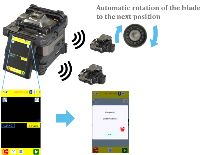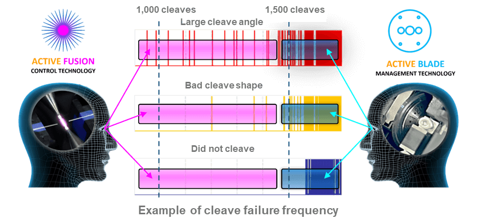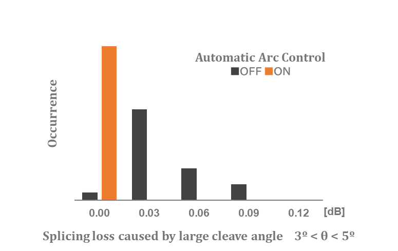 The below graphs show the number of cleaves on the horizontal line with frequency of large cleave angle, bad cleave shape and no cleave at all. When the frequency of large cleave angle increases, Active Blade Management Technology can detect this increasing ratio point and rotate the blade position automatically. Active Blade Management Technology significantly reduces frequency of large cleave angles occurring but even when it does occur Active Fusion Control Technology can reduce high splice loss by precise fusion control.